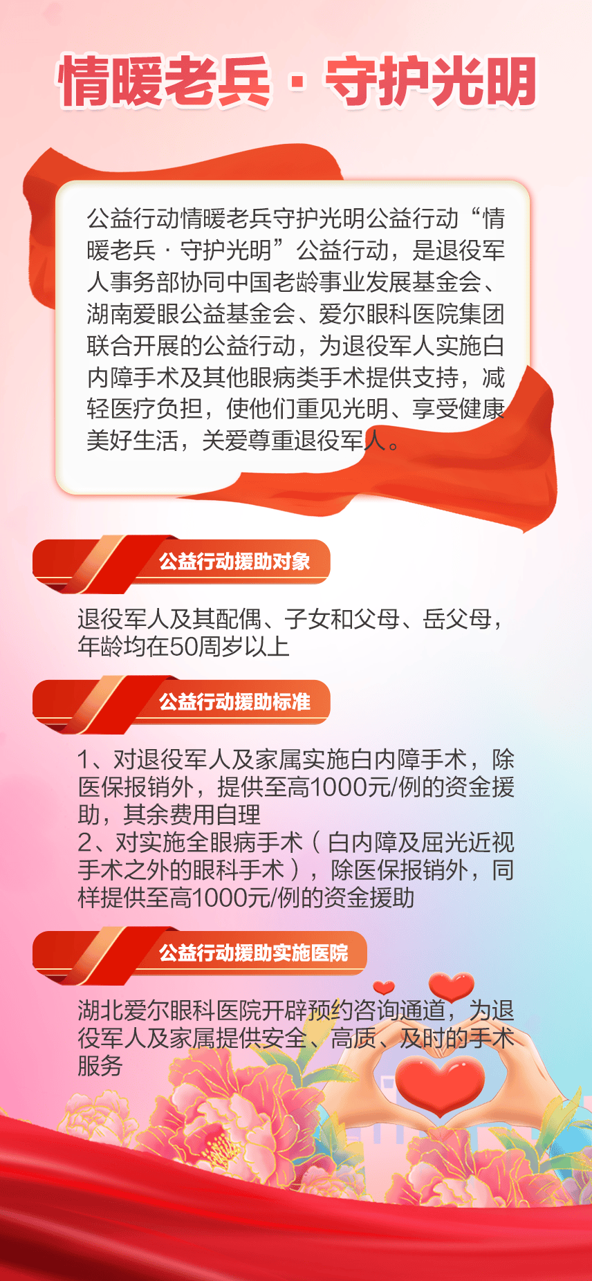 退役军人是我们国家的忠诚卫士,为国防事业作出不可磨灭的贡献。即便脱下军装,他们依然值得我们全社会的感念与关怀。“情暖老兵·守护光明”不仅是一场医疗救助,更是一份深深的社会敬意。我们期待通过这一公益行动,切实提升受助群体的视觉健康和生活质量,让他们的晚年过得更明亮、更安心、更温暖。