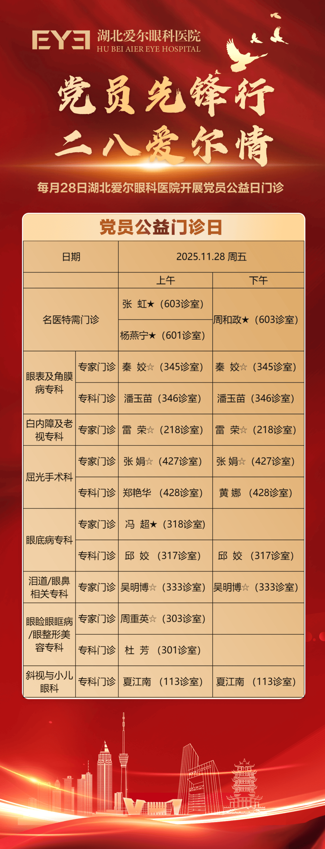 为响应全民眼健康号召,深化区域化党建共建,把党组织的关怀与温暖实实在在送到群众身边,湖北爱尔眼科医院党支部正式将每月28日定为常态化 “党员公益门诊日” !2025年11月28日,首场公益义诊即将暖心开启,400个免费号源限时发放,邀您共享优质眼科服务。
