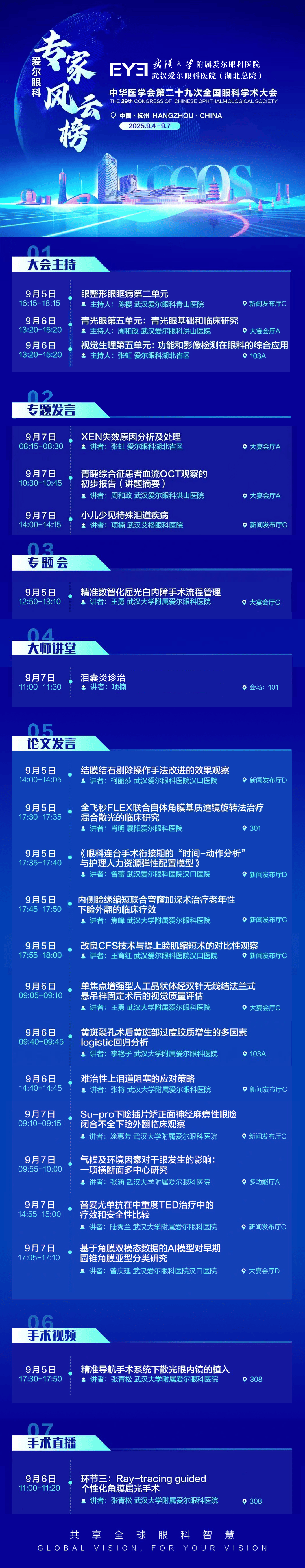 爱尔眼科医院集团鄂豫区专家团多年来于临床一线深耕不辍,始终紧跟眼科医学发展前沿,在多个亚专科领域积累了扎实的实践经验与多元化的探索成果。本次大会上,他们将与来自国内外的眼科同仁围绕临床诊疗技术、科研创新方向等展开深入交流,将临床实践中的思考与探索融入学术探讨,为眼科领域的创新发展贡献智慧与见解。