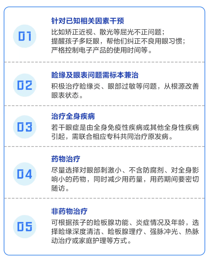 根据2024年爱尔眼科发布的《爱尔儿童干眼诊疗指导意见》,干眼症的治疗需从病因、药物、非药物、心理疏导等多方面入手,具体包括: